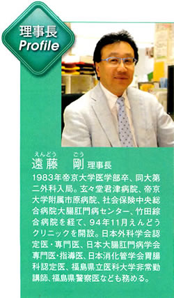 ![]() | 患者さんと医療機関の「距離感」を縮めるため独自のスタイルで地域に情報発信 えんどうクリニックは遠藤剛理事長(53)以下、看護・事務・厨房の各部門スタッフが「三位一体」となった総合力がある10床の有床診療所です。内科では主にプライマリケアを担いますが、理事長が特に専門とする領域は胃腸、肛門疾患。 内視鏡検査の経験が豊富で、肛門疾患で入院を伴う手術は年約300件、痔疾患の日帰り手術は約100件にのぼります。 こうした実績は、患者さんが納得する診療、分かりやすい医療を提供するという理念に基づくものです。そこには、患者さんが医療・医療機関を身近に感じてくれるようにと独自の工夫を凝らした情報提供ツールの効果もありました。 |