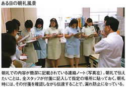 始業前の朝礼には看護師全員と、他の各部署からは最低2大が出席し、前日の反省や申し送り、新たな注意喚起、また院長からのタイムリーな医療情報の提供等が行われる。