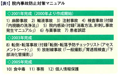 03年には、新たに「転倒・転落事故」「放射線事故」が、05年には「食中毒」「事務(表3)」「個人情報保護」が追加され、現在は12項目をベースに、安全管理の徹底が図られている。